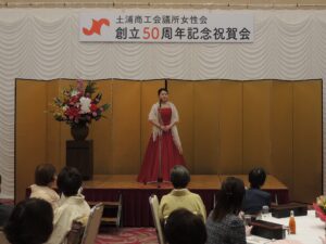 式典では、矢口会長、中川会頭のごあいさつ、ご来賓の安藤市長と、茨城県商工会議所女性会連合会の松橋会長のご祝辞をいただき、40周年からの10年間の歴代会長に感謝状の贈呈を行いました。式典終了後は、土浦市出身のソプラノ歌手 髙橋侑さんの独唱が披露されたあと、和やかに祝宴が開催されました。