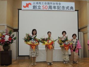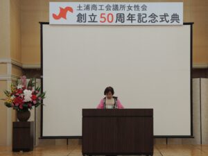 10月23日、創立50周年記念式典並びに祝賀会を、ホテルマロウド筑波にて開催いたしました。土浦商工会議所の中川会頭、安藤市長はじめ、多くのご来賓の方々、また、県内商工会議所女性会の皆様にご出席いただき、盛大に開催できましたこと、深く感謝いたします。